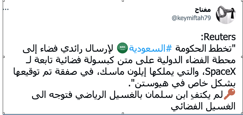 فالحساب السعودي الشهير مفتاح قال إن ابن سلمان لم يكتف بالغسيل الرياضي فتوجه إلى الغسيل الفضائي